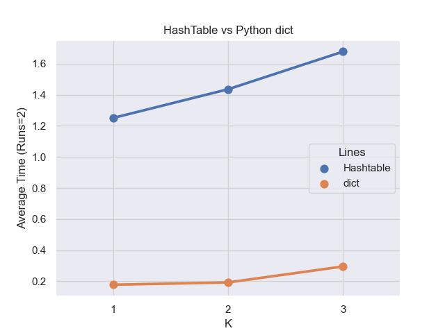 While developing the program, I experimented with both hashtables and dictionary as data structures to store the trained Markov models. The following graph shows the relative performance of the two data structures.